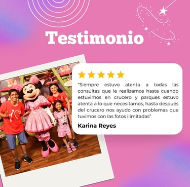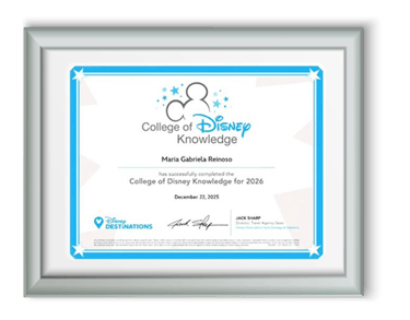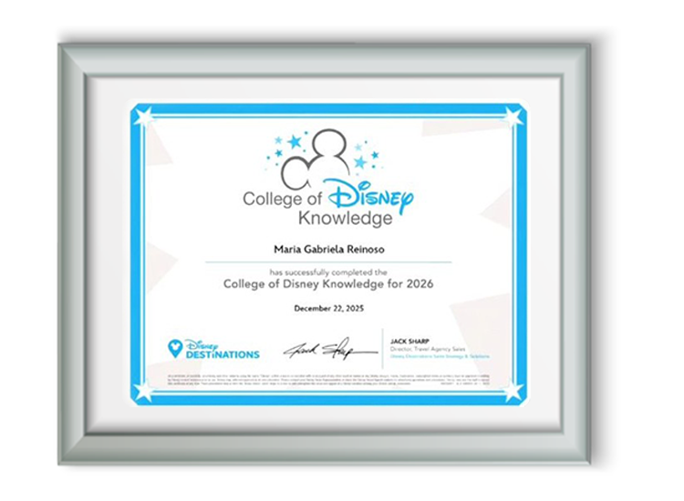 Como Agente Certificada, he viajado en múltiples ocasiones a los parques Walt Disney World, Disneyland California, Universal Orlando Resort y varias líneas de crucero, como Disney Cruise Line y Royal Caribbean.